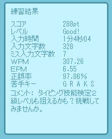 ミリア:……? キッド:あーっと、わからない人とミリアの為に解説(苦笑) 背後、技術職としての課題で『15分でこれだけ打て』って、A4で4枚強のプリント渡されて。 背後:課題攻略にはとにかく早く打つしかない、という訳でe-typingの自己ベスト更新を目指してたっ で、自己ベストだった『評価S』を超えた、社長の『忍者』に遠く及ばなくともちょっとは自信ついたっ 背後:自信ついた横で同僚が『サンダー来たっ』って叫んで、 30分もしないうちに『この課題無理っ』って叫んだがなっ ちなみに、技術職として内定貰った全員が、このA4に4枚相当の課題をもらいました。…誰もできてないけど。 あと、e-typingにはSとか"Good!"以外にも称号があって、 最高はGodhand、以下順にJedi/Tatujin/Rocket/Meijin/EddieVH/LaserBeam/Professor/Comet/Ninja/Thunder/Fast/Good!/S/A+/A/A-/B+/B/B-/C+/C/C-/D+/D/D-/E+/E、最低ランクが E- らしいです。 …社長(Ninja)まで、あと50ptぐらい。 最後に、新居決まりました。…昨日みたいな、ネタじゃなくて。手続きは書類不備が多くてまだだけど(っд`) PR