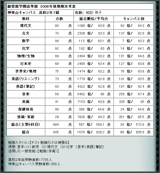 そして昨日、結果が返ってきました。 ……背後(リアル)的には、勉強スタイルだ乱数だ何だを元にサーバーが点数計算して、なんだろうけど、 設定(キャラ)的には先生たちが1日で数ひゃ…数万枚の回答用紙を採点して、通信簿につけて…と考えると、先生の苦労が目に浮かびますw 自キャラ(城田恭子・b01069)のテスト結果はこんな感じになりました。 国語60点ちょい、数学と化学が90点ちょい。苦手なはずの英語が60点。 保健体育が96点、技術家庭科が28点―どっちも実技(得意な体育と苦手な料理)が要因のようです? だいぶ前に書いたユーザースクリプト(FirefoxでIE同様にサムネイルするためのスクリプト)、不具合があったので改修しました。 ……パッチファイル置こうかと思ったものの、行数が当てにならないので、全文置いています。 // ver 2.0 2008.11.15 // TW1(無限のファンタジア)、TW2(シルバーレイン)の両方に対応 // ver 2.1 2009.3.15 // NPC(投票不可)で投票できる不具合があったので、修正しました // 何もしない条件(サムネイルがある環境) // length == 0 : 状況がわからないが、少なくとも参照自体がエラー // length == 1 : 存在しないキャラクターID if (document.getElementsByTagName('script').length < 2){return;} var tw_thumbnail = { init: function(){ this.tw_prd = this.get_array('prd'); // 本家が使える場合は何もしない if ((document.all) || (this.tw_prd.length == 0)){return;} // DOMをサポートしていない場合、エラーが起こるので中断する if (!document.getElementById){return;} // IDを取得 var id_fild = this.img_sorce[this.img_sorce.length - 42]; var start = id_fild.indexOf('value')+7; var end = start + 6; var char_id = id_fild.substring(start, end); // 変数を取得 this.tw_vlabel = this.get_array('votelabel'); this.tw_lid = this.get_param('lastid'); this.tw_prm = this.get_param('getparm'); this.tw_in = this.get_param('login'); this.tw_votebtn = this.get_element('votebtn'); // スペーサーの高さを計算 var max_height=0; var init_height=0; for (var i=0;i<this.tw_prd.length;i++){ img_height = this.tw_prd[i][12].match(/height.*/); if (img_height){ image_height = parseInt(img_height[0].substring(8, img_height[0].length-1)); max_height = Math.max(max_height, image_height); if (i==this.tw_lid){init_height = image_height;} } } if (typeof(max_height)=='number'){this.max_height = max_height + 80;}; var spacer=document.createElement('div'); document.getElementsByTagName('body')[0].appendChild(spacer); spacer.setAttribute('id', 'spacer'); spacer.style.height = init_height+'px'; this.novotemsg = (this.tw_in) ? '未投票' : ' '; this.write_sorce(); this.init_link(char_id); this.get_element('prdmain').innerHTML = this.create_prd(this.tw_lid); }, // リンクの張り替え init_link: function(myid){ if (!this.tw_in){ for (var id=0; id<this.tw_prd.length; id++){ if (id == this.tw_lid){ this.get_element('tmb' + id).style.borderColor = '#ee1111'; } else { this.get_element('tmb' + id).style.borderColor = '#3333ee'; } this.get_element('tmbvote' + id).innerHTML = this.novotemsg; this.get_element('tmblink' + id).href = 'javascript:tw_change(' + id + ')'; } this.tw_votebtn.innerHTML = this.create_btn(this.tw_lid); return; } var vformval = '<form name="vform" id="vform" action="'+this.action_path+'/ils_gvote.cgi">'; vformval += '<input type="hidden" name="myid" value="'+myid+'">'; vformval += '<input type="hidden" name="getparm" value="' + this.tw_prm + '">'; for (var id=0; id<this.tw_prd.length; id++){ if (id == this.tw_lid){ this.get_element('tmb' + id).style.borderColor = '#ee1111'; if (this.tw_prd[id][4] == '' || this.tw_prd[id][8] == ''){ this.tw_votebtn.innerHTML = this.create_btn(id); this.get_element('tmbvote' + id).innerHTML = (this.tw_prd[id][4]==''?'投票不可':this.novotemsg); this.get_element('tmbvote' + id).style.color = '#ff0000'; } } else { if (this.tw_prd[id][4] == ''){ this.get_element('tmb' + id).style.borderColor = '#9999cc'; this.get_element('tmbvote' + id).innerHTML = '投票不可'; this.get_element('tmbvote' + id).style.color = '#9999cc'; } else if (this.tw_prd[id][8] == ''){ this.get_element('tmb' + id).style.borderColor = '#3333ee'; this.get_element('tmbvote' + id).innerHTML = this.novotemsg; this.get_element('tmbvote' + id).style.color = '#ff0000'; } else{this.get_element('tmb' + id).style.borderColor = '#9999cc';} } this.get_element('tmblink' + id).href = 'javascript:tw_change(' + id + ')'; vformval += '<input type="hidden" name="odrid' + this.tw_prd[id][0] + '" id="odrid' + this.tw_prd[id][0] + '" value="">'; } vformval += '</form>'; this.get_element('voteform').innerHTML = vformval; this.get_element('allvotebtn').innerHTML = '<input type="button" value="一括投票" onclick="tw_submit()">'; }, get_element: function(id){ return document.getElementById(id); }, // ボタンを生成 create_btn: function(id){ var buf; if(!this.tw_in){ buf='<table border="0" width="320" cellspacing="4" cellpadding="4"><tr><td><br>'; buf+='あなたはログインしていないので、<br>投票できません。'; buf+='<br><br><br><br></td></tr></table>'; } else if ((this.tw_prd[id][4]=='')||(this.tw_prd[id][17]=='0'&&this.tw_serial==2)){ buf='<table border="0" width="320" cellspacing="4" cellpadding="4"><tr><td><br>'; buf+='この作品には投票できません。'; buf+='<br><br><br><br></td></tr></table>'; } else if(this.tw_prd[id][8]==''){ buf='<table border="0" width="320" cellspacing="4" cellpadding="0" align="center">'; buf+='<tr><td colspan="4"><b>この作品に投票する</b><br>'; buf+='(「一括投票」ボタンでまとめて投票されます)<br></td></tr><tr>'; for(var i=1;i<=8;i++){ buf+='<td><a href="javascript:tw_store('+id+',\''+((i==8)?'n':i); buf+='\')"><img src="'+this.vote_img_path+'/ill_
