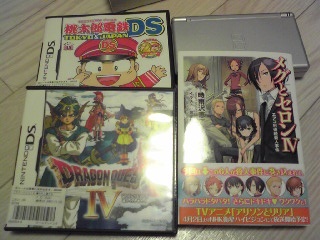 締め切り時間が過ぎてる、と言われました。 試験場に2時半着、初回なので締め切りは2時まで…… ヽ( `д´)ノ 帰りに、自棄買いをしまs―衝動買いをしてしまいました。 大学4年時代に、(研究室命令で)DS借りてゲームやってたのを思い出して、久々にやりたくなって。 DS用ソフトで、勇者とかトルネコが出て―と朧な記憶で、ドラクエ4を買いました。 本体持ってないのでDS-lite(画像右上)も。 ……順番間違ってる気もするけど、まぁいいや。 新刊出てる事に気付かず、衝動買いでメグセロ4巻も。 ……血液型の『説明書』も買おうかと思ったけど、1冊1000円だったのであきらめました(ノ_・。) PR