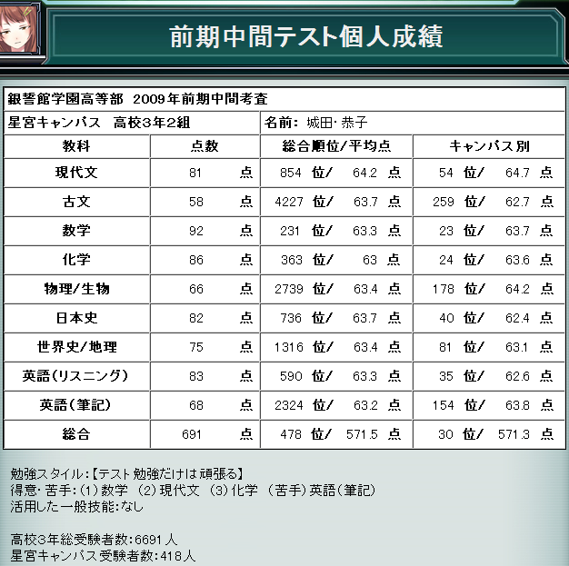 ミリア:デスペナルティ無しはともかく、『攻撃の専用アイテム』『一撃死防止用アイテム』まであるってどんなゲームでしょう……。 キッド:銀誓館の入手した情報から考えると、『ドラゴンのブレスで全滅させて、魂を回収』って目的だったんだろうけど……。 背後:とりあえずは、一安心だな……恭子の周り以外は。 城田:撃ちたい…ゴースト…… キッド:……これは、禁断症状? シルバーレインのソフトボール、前の記事では順位がわかりませんでしたが、スイストーナメント用の順位づけがあるようなので順位付けてみました。 高3部門、恭子のチーム(ゴールドセボーラー)は6勝1敗、210チーム中5位。 ちなみに、チーム数合わせで参加していた先生たち(先生ジャイアンツ)は207位。 ……ソートプログラムに時間かけすぎた orz (HTMLの対戦カードと、最終戦の勝敗を登録したら順位づけるJSプログラム書いて、 リアイベの待ち時間に細かい不具合直してました。 ソートのアルゴリズムは通って、順位付きで表示するのに失敗して…。 丸1ヶ月かかった orz) ちなみに、順位は「総ポイントの多いチーム」を上位に、 同ポイントは「対戦相手の勝ち数(合計)が多いチーム」、 「対戦相手の負け数(合計)が少ないチーム」の順で上位に来るように、 対戦相手の負け数でも区別が付かない場合は同率として扱ってます。 高3部門のランキングはこちら―って長いな(汗) 1位 晶世三十二歳崖っぷち 2位 予備校よりもソフトだろ 3位 早坂三の四 4位 惑星ベジータ 5位 ゴールドセボーラー 6位 フリージングタイムゲート 7位 超人血盟軍 8位 白野威 9位 トリプルスリー 10位 乱闘上等かっとばし野郎 11位 オーディンズ 12位 唸れ超強い金属バット 13位 名倉ビューティーズ 14位 必中熱血幸運努力でゴー 15位 永輿宮ピクチャーズ 16位 男前アンラッキーズ 17位 ひびきんと愉快なお友達 18位 キノコ 19位 アルカイックスマイル 20位 マッスルコンサート 同率21位 エキセントリックダミーズ 同率21位 チョーク乱舞 23位 赤翼 24位 絶対迎撃型顔布家政婦集団 25位 百三十六の必殺打法 同率26位 瑠璃桜 同率26位 綿津羽ー高三の一 28位 球派投法不敗 29位 魔の暴走回転列車 30位 明日はホームランだ 31位 戸叶高3-3組・B 32位 綿津羽ビッグボイス 33位 一匹狼オーエンズ 34位 早坂元 35位 番凩 36位 亀谷美声 37位 アンビシオン 38位 九人の正義超人 39位 ゲーム姐さん 40位 瑠璃堂サニーズ 41位 だらしなくて涙もろい 42位 武士道 同率43位 ピンクタイフーン 同率43位 ビューティースーツ 45位 仁奈森デュオ 46位 五月病ブレイカーズ 47位 月詠バッカス 48位 サンライトブルー 同率49位 蘇矢部サンクス 同率49位 ダンテと愉快な仲間たち 同率49位 チョーク投げ名人 同率52位 木幡黙示録 同率52位 辺見ヶ原高3-7組・D 54位 糸ミミズとフナとポンデ 55位 よもっさん 56位 ちっちゃいって言うなぁ 57位 ほりがはらーず 58位 スーパーギャラクシーズ 59位 ガーネリアンズ 60位 りとることらちゃんず 61位 春疾風B 62位 一縷樹高3-2組・D 63位 三枚目とクールの中間達 64位 オヤジギャグはご勘弁 65位 だみ声リッキーズ 66位 モフモフモフっこ 67位 受験生でも球技大会 同率68位 プリティーキバタン 同率68位 戸叶ギャンブラーズ 70位 エトワール 同率71位 ポエマーズ 同率71位 鳥珠サンライト 73位 バーニングロンリーウルフ 74位 俺達のジャスティス 75位 ワイルドさま~ず 同率76位 ちーむスタイリッシュ 同率76位 遊撃部隊鹿 同率76位 予定は未定で勝敗も未定 同率79位 シネマコンプレックス 同率79位 ビリーズブート大畠 81位 サーティスリースターズ 82位 百合姫 83位 ノリノリきのこカーニバル 84位 怪しいものではありません 同率85位 アフロスターズ 同率85位 我が組の猛攻で人類滅亡 87位 男装少女も捕食対象B 同率88位 サンキュータカシーズ 同率88位 可愛い先生は好きですか 90位 オマカセ 91位 なんとなくソロ活動 92位 ギャンブラーズB 93位 イーグル牟田 94位 被虐の暴走回転列車 95位 チャンネルはそのままで 96位 未来の歌声 97位 しおりんはマイペース 98位 一縷樹高3-4組・B 99位 鳥珠高3-5組・D 100位 先生の方言が分かりません 101位 もう勝負ついてるから 102位 サンバーナイン 103位 ボブ 104位 まかせたー 同率105位 一縷樹高3-3組・A 同率105位 ボールとバットと漢と乙女 107位 ホワイトバッファローズ 108位 ワイルドな世界史 同率109位 担任は大丈夫なのか色色と 同率109位 神楽山プラムズ 111位 みっかみかにしてやんよ 112位 ウチの担任って素敵やん 113位 とりたまサンキューズ 114位 初めての音 115位 赤坂満腹シネマズ 116位 千尋谷フィジクス 117位 八咫鴉 118位 仁奈森高3-7組・D 119位 男装少女も捕食対象A 120位 葉月ハーレムズ 同率121位 ピュアエンジェル日和子 同率121位 リコリス 同率121位 のんびり屋さん 124位 誓いのフォーメーション 125位 方言はステータス 126位 そやべやな 127位 須田鷹雄 128位 魔球乱舞 129位 千尋ライオンズ 130位 鷹崎バスターズ 131位 おまかせまんぼ 132位 辺見ヶ原高3-1組・A 133位 るりどうーや 134位 冷泉