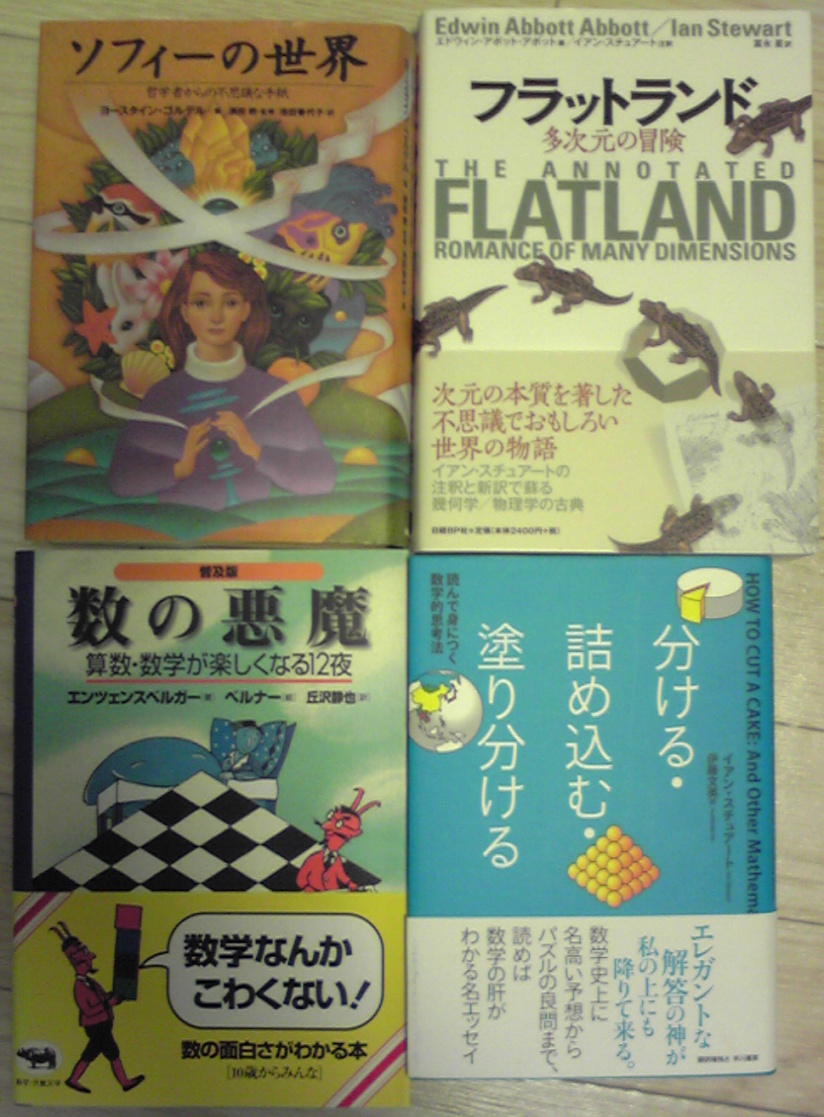 いや、疲れているのでなく、憑かれているのかも知れない。 本の虫に、あるいは数の悪魔に。 あるいは、単に懐かしく思っているだけかも知れない。 単に知識欲が増えているだけかも知れない。 ほんを、かいました。 昨日2冊買って、未読本が4冊に増えました。 左上から時計回りに「ソフィーの世界」、「フラットランド」、「分ける・詰め込む・塗り分ける」、「数の悪魔」の4冊。 中学時代に数の悪魔(左下)を、高校時代にソフィーの世界(左上)を読んで、懐かしさでつい買ってしまい。 無知の知(※1)を痛感し、また数学の不変性(※2)に魅かれ……。 なんかもー、人間の道を脱線して直角にそれて行ってる気がする(苦笑) ※1)どっかの偉い人が言った言葉で、『何も知らないという事を知っている』という事。 この世の事象の多くが科学で解明はされているものの、その本質や背景については何も知らない、という事。 ※2)数学の、と言うと少し違うかも知れない。 ただ、数の定義が変わりでもしなければ、1+1は(2進数でなければ)2である事は変わらないし、メンガーのスポンジとかの図形・立体が自己相似な事は変わらない。 PR